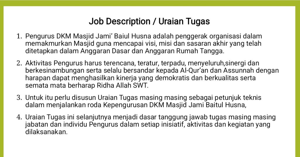 JOB DESCRIPTION (URAIAN TUGAS) DKM MASJID JA’MI BAITUL HUSNA PERIODE KEPENGURUSAN 2024-2027
